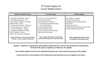 2016-2017 LMS School Supply List *Be sure to restock supplies such as pencils, pens and paper as needed throughout the school year* 6th Grade Supply List 7th Grade Supply List ... Access This Document